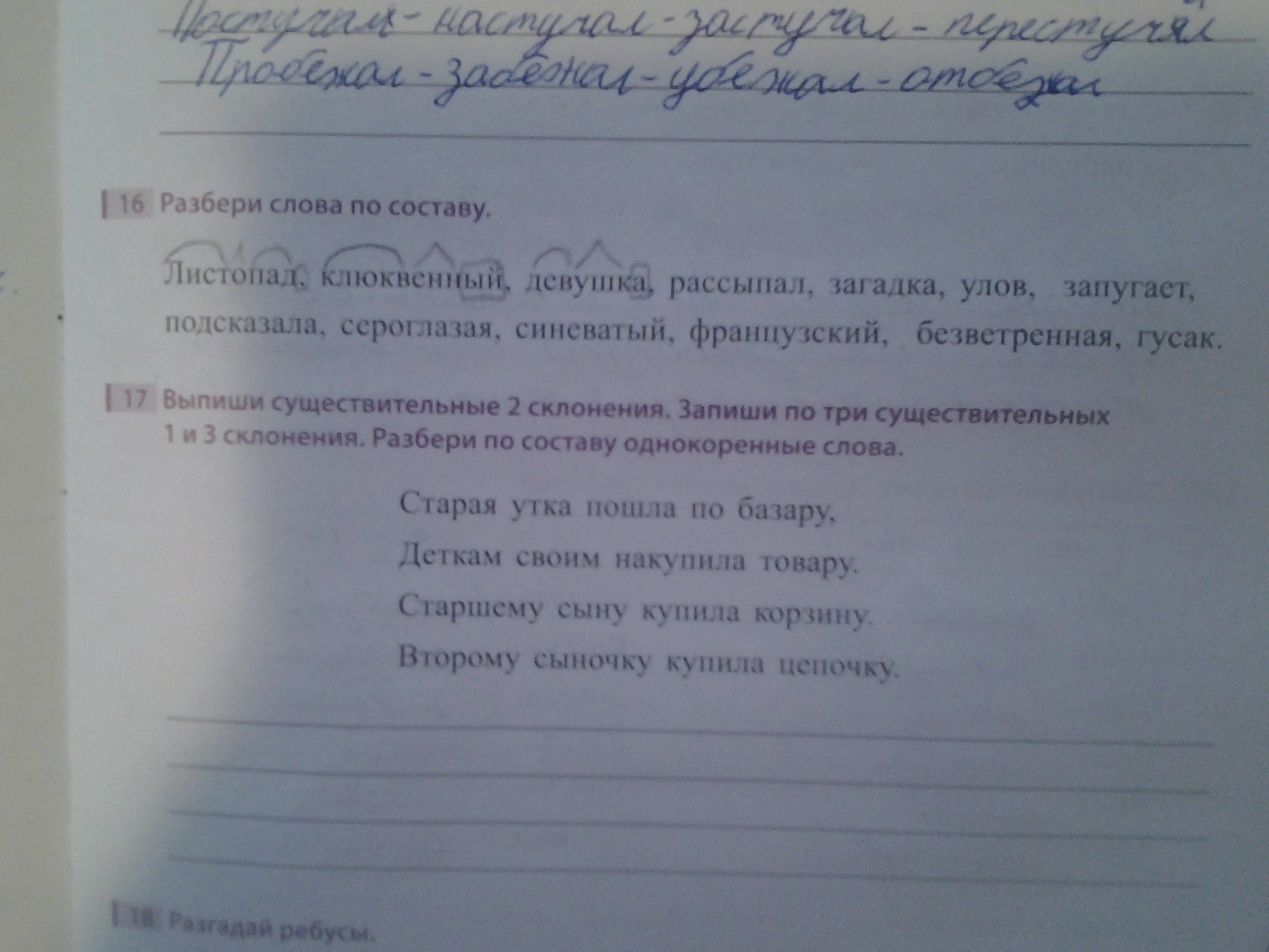 Базару, товару, сыну - 2 скл. Утка, корзина, цепочка - 1 скл. 3 скл нету. Однокоренные слова: накупила, купила; сыну сыночку. Разбор слова накупила: на - приставка, куп -корень, и, с -суффиксы, а - окончание. Купила тоже самое без "на". Сыночку: сын - корень, очк - суффикс, у окончание. Сыну без суффикса "очк".