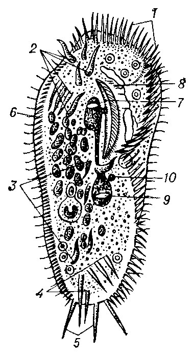 Рис: Стилонихия (Stylonychia mytilus): 1 — мембранеллы адоральной зоны; 2— 5 — разные группы цирр; 6 — боковые ряды цирр; 7 — перистом; 8 — ундулирующая мембрана; 9 — макронуклеус; 10 — микронуклеус.