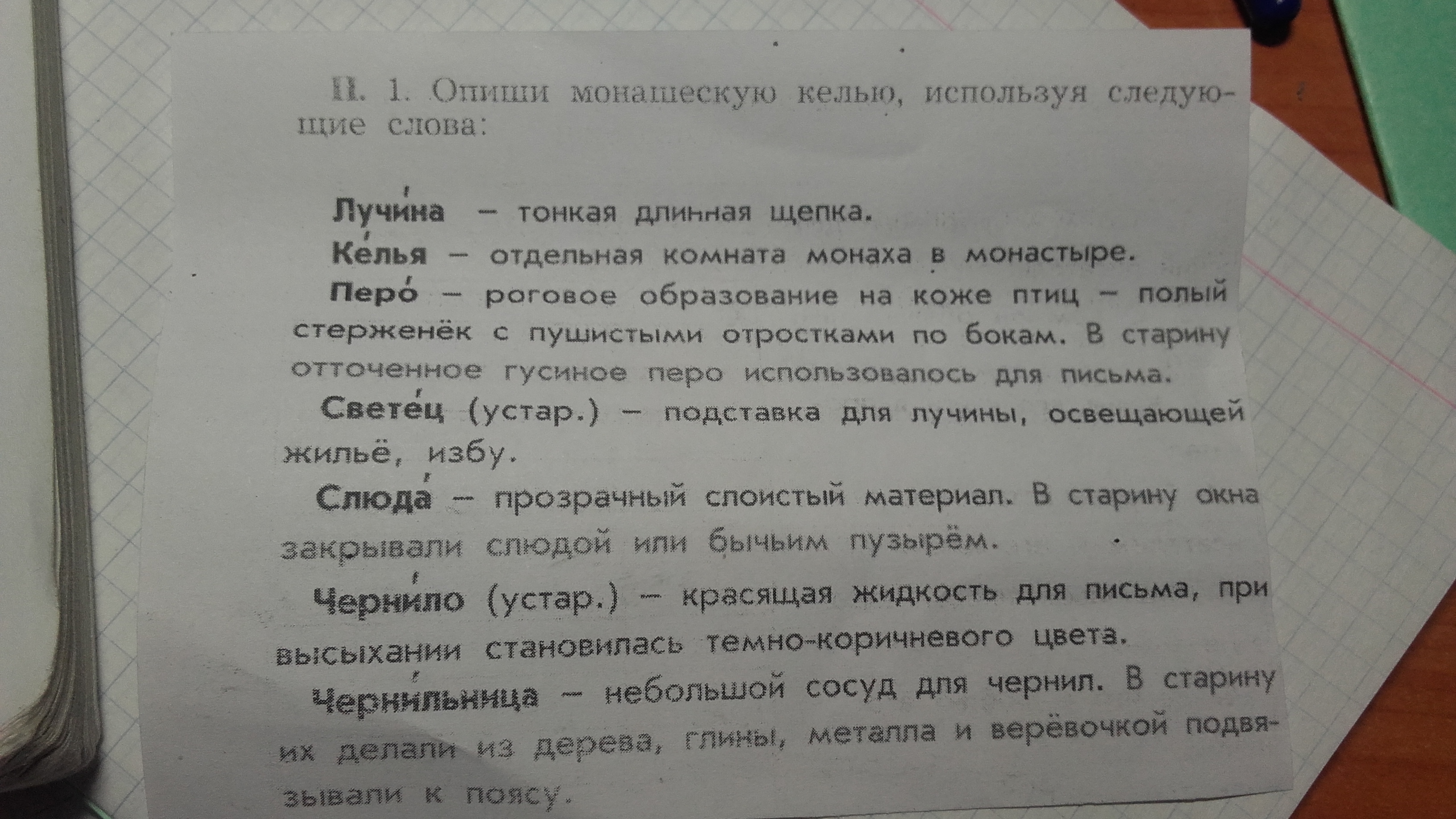 освещение в скромной монашеской келье было скудным. Через слюду в окно солнечный свет проходил плохо. в углу комнаты, рядом с иконами, стоял светец с потухшей и до сих пор тлеющей лучиной. в центре кельи стоял стол, на котором, в свою очередь, лежала опрокинутая чернильница. чернила медленно стекали на пол. в черной луже чернил лежало перо.