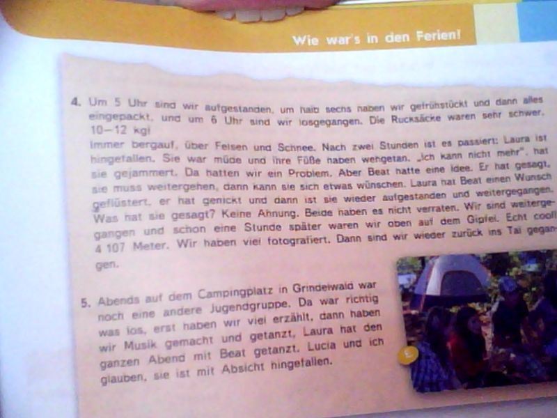 5. Вечером, в палаточном лагере Гринвальд была еще одна молодежная группа. Тогда было по-настоящему интересно (весело) : сначала мы много друг другу рассказывали, потом мы играли музыку и танцевали, Лаура целый вечер танцевала с Битом. Лючия и я полагаем, что она специально упала.