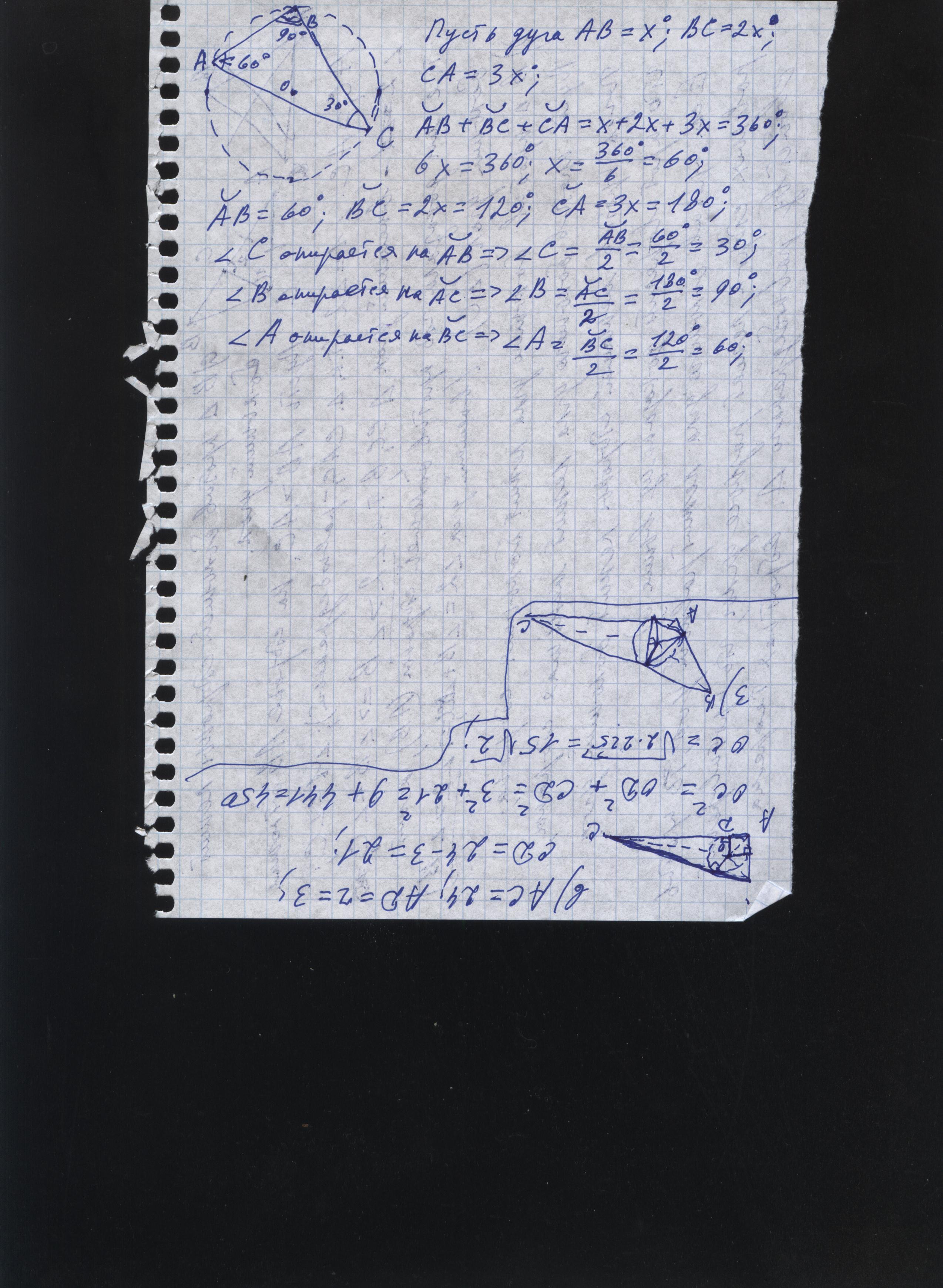 Окружность разделена тремя хордами в отношении 1:2:3. Опредилите углы образованного треугольника. можно с рисунком