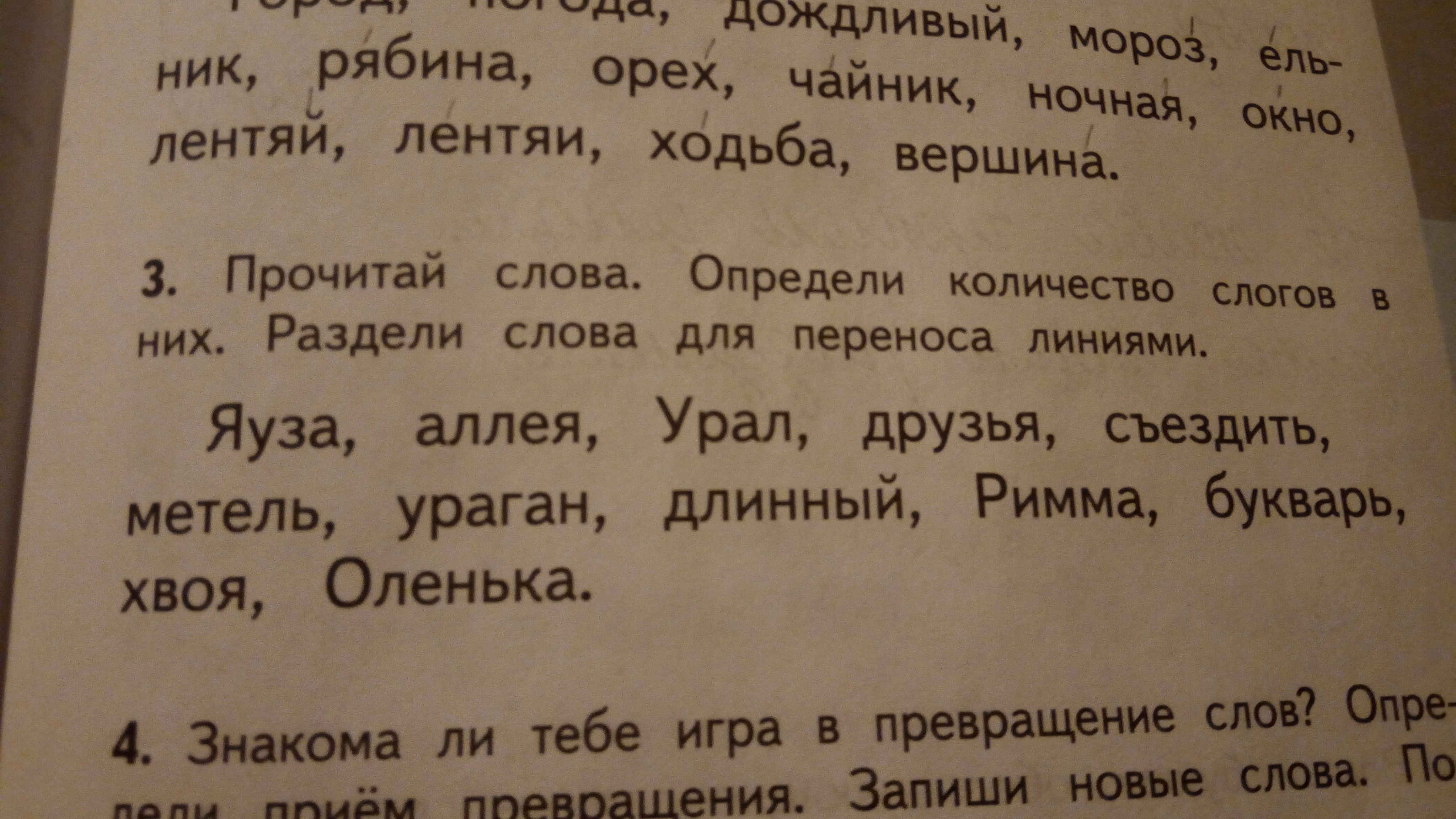 ал-ле-я, я-у-за. у-рал. друзь-я. съез-дить. ме-тель . у-ра-ган. длин-ный. рим-ма. бу-кварь. хво-я. о-лень-ка