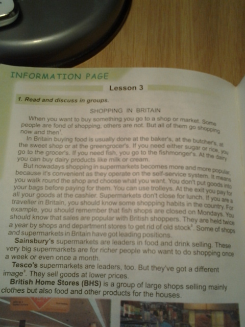 Но в настоящие дни покупка в супермаркете становится все более и более популярной потому что это очень удобно и обслуживающий персонал пользуется специальной техникой,что облегчает и ускоряет процесс покупки. Это значит что ты идешь по супермаркету и выбираешь сам все то,что тебе нужно. Ты не положишь свою покупку в сумку ,пока не заплатишь за неё. Ты можешь воспользоваться коляской(каталкой как её там называют) А в конце платишь деньги за все свои вещи кассиру. Супермаркеты не закрываются на обед.А если ты приезжий в Британии,то ты должен знать несколько вещей. Например,ты должен знать что рыбные магазины закрыты по понедельникам. Также ты должен знать что для британских продавцов характерны очень частые скидки . Они разбирают все дважды в год и вместе со своим главным офисом заменяют и избавляются от просроченных продуктов. Поэтому большинство магазинов в британии имеют ведущие позиции.