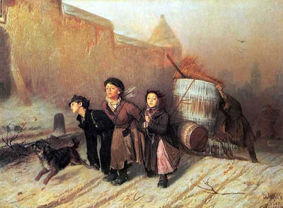 Раннее морозное утро, город покрыт густым серым туманом, по снежной улице трое изможденных детей тянут на санях бочку с водой . Видно, мастер пораньше разбудил их и отправил на речку за водой.