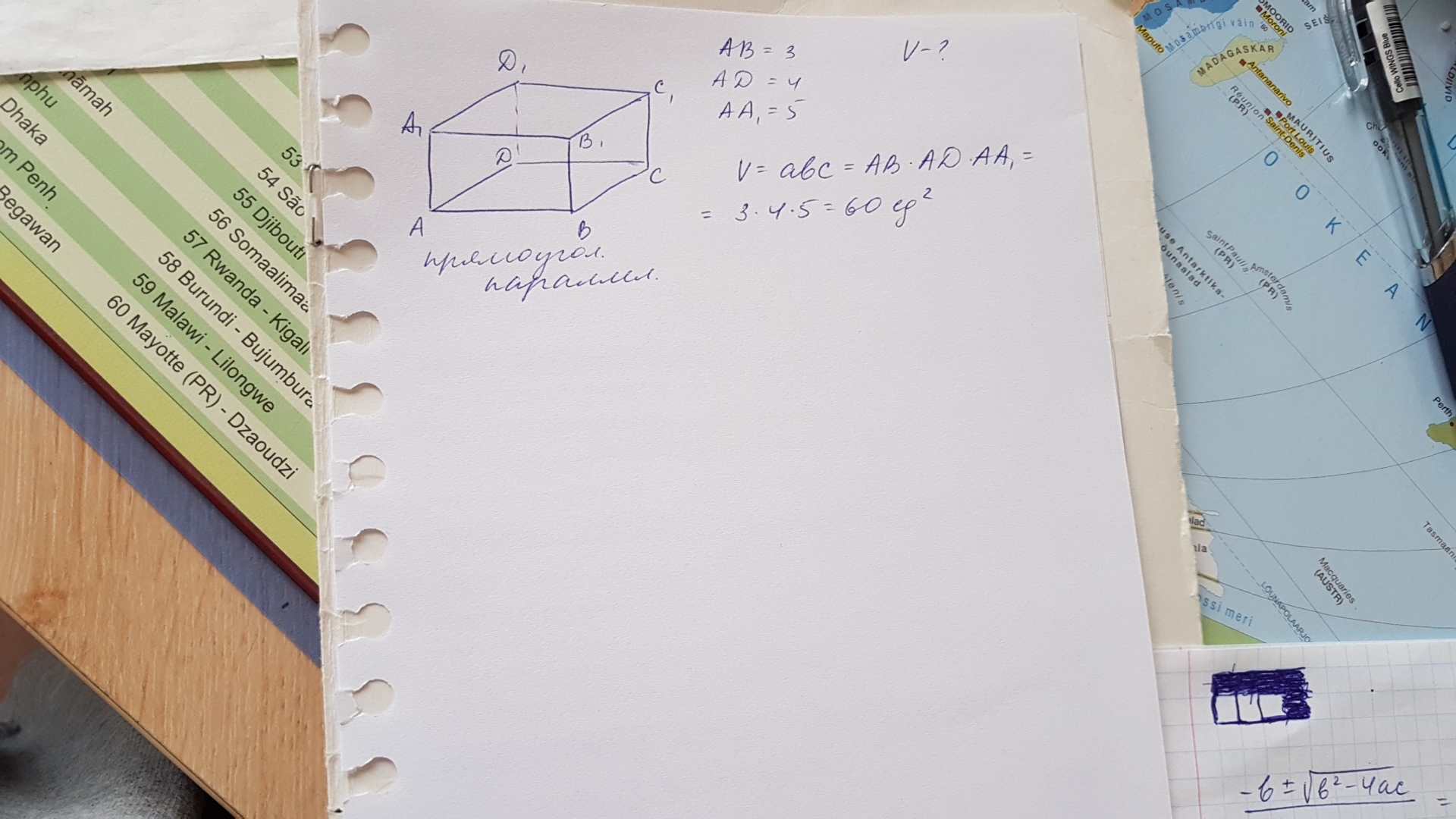 V=АВ·АD·АА1=3·4·5=60 куб. ед.