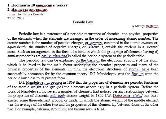 1. What is the periodic law? 2. What is the atomic number? 3. What particle has a positive electric charge? 4. What particle has a negative electric charge? 5. Where are protons and electrons located within an atom? 6. What is the periodic table? 7. Who stated the first periodic law? 8. When was this law proposed? 9. In what year and who first stated the existence of triads? 10. What is a triad? Annotation: The article is headlined "Periodic Law" and it was written by Marilyn Senterfitt. It was published in the Nature Friends on 27th May 2008. The purpose of the article is to inform the reader of the principle behind the periodic law. The article mentions who was the first person to propose the periodic law. The author also points out a previous scientist who noticed the existence of triads. In my opinion, the text could be more elaborate and the author could have provided some visual examples of the elements and their properties to make it easier to understand. But generally, I found the article fairly useful as a basic introduction of the periodic law.