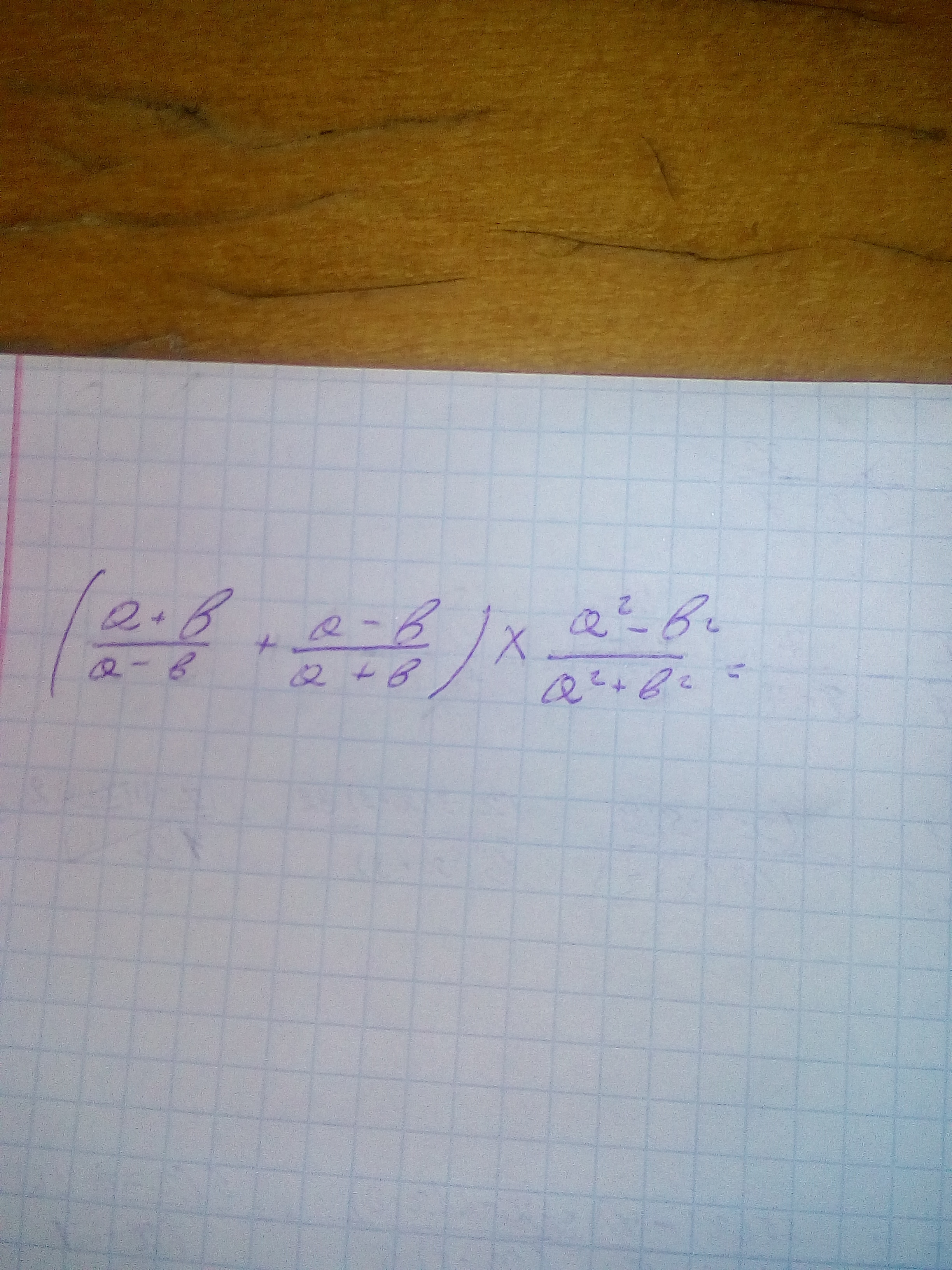 (frac{a+b}{a-b}+frac{a-b}{a+b})cdotfrac{a^2-b^2}{a^2+b^2}=frac{(a+b)(a+b)+(a-b)(a-b)}{(a-b)(a+b)}cdotfrac{a^2-b^2}{a^2+b^2}=\\=frac{((a+b)^2+(a-b)^2)(a^2-b^2))}{(a^2-b^2)(a^2+b^2)}=frac{(a+b)^2+(a-b)^2}{a^2+b^2}=\\=frac{a^2+2ab+b^2+a^2-2ab+b^2}{a^2+b^2}=frac{2a^2+2b^2}{a^2+b^2}=frac{2(a^2+b^2)}{a^2+b^2}=2.