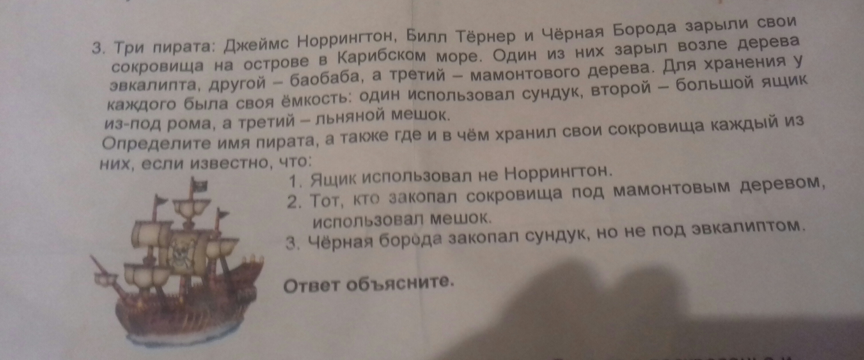 Черная борода- закопал сундук под боаба( сундук по условию, еще написано что под мамонтовым деревом закопали мешок, значит мамонтовое дерево отпадает, и написано что он спрятал сундук не под эвкалиптом- остается боабаба)