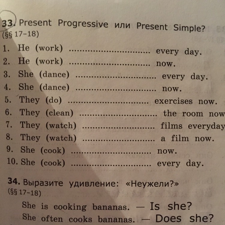 1. Works, 2. Is working, 3. Dances, 4. Is dancing, 5. Are doing, 6. Are cleaning, 7. Watch, 8. Are watching, 9. Is cooking, 10. Cooks