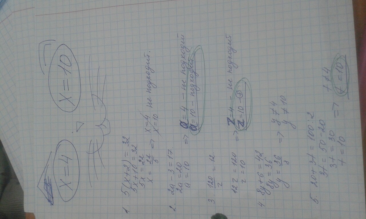 Выполните подстановку и установите,решением каких уравнений является число1)4;2)10: б)5(x+2)=32;в)2а-3=17;г)120:z=12;д)8у+6=42-4;е)20+3t=100:2