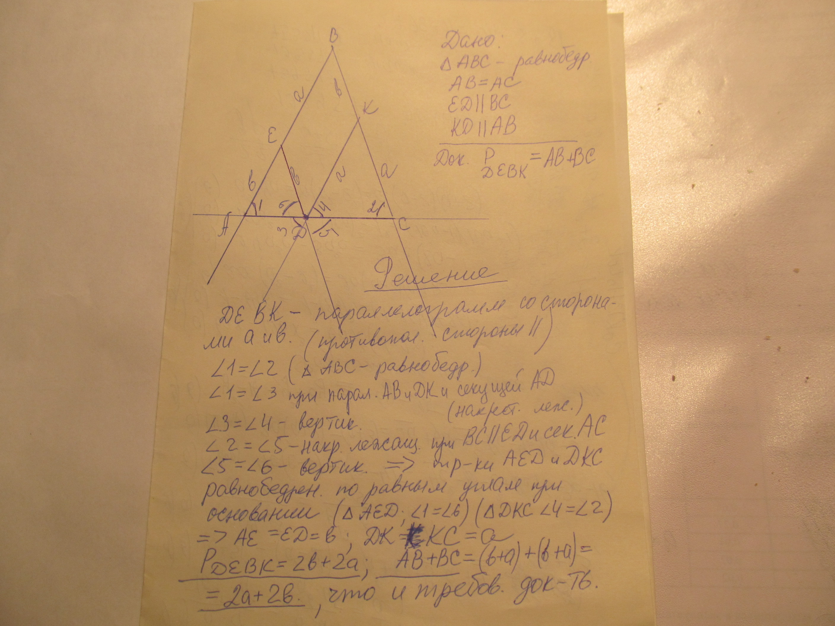 Через произвольную точку основания равнобедренного треугольника проведены две прямые, параллельные боковым сторонам. Доказать, что периметр полученного четырехугольника равен сумме боковых сторон треугольника.