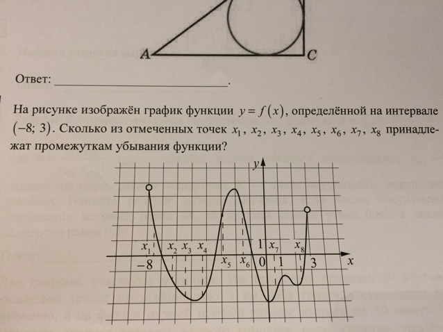 На рисунке изображен график функций y=f(x), пределённые на интервале (-8;3). Сколько из отмеченных точек x1, x2, x3, x4, x5, x6, x7, x8 Принадлежать промежуткам убывания функции?