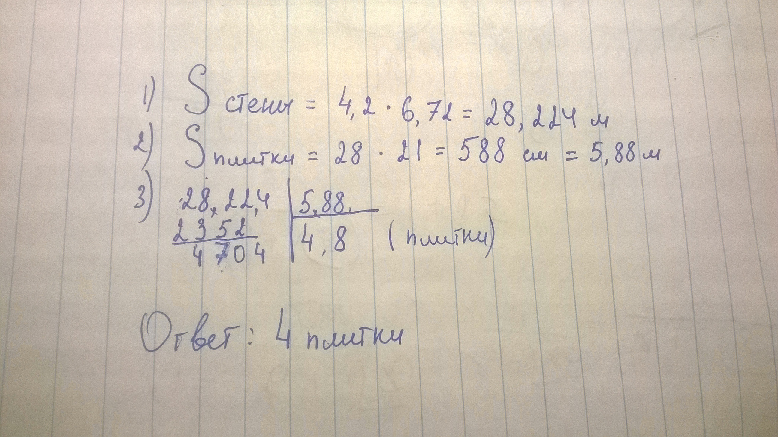 Прямоугольную стену размером в 4,2 м умножить 6,72 м должны выложить керамической плиткой.Сколько плиток понадобится,если размер одной плитки 28см