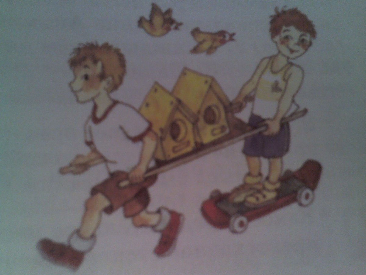 вася и петя шли вешать кормушку..тот,что впереди так спешил..что тот,что сзади не успевал за ним.Тогда придумали они что петя будет ехать на скейте..и понеслись они ..но не расчитали скорост ьскейта..и он снес васю и тот плюхнулся на петю...вот мчатся они один на другом сидит и кормушка с ним..вот по инерции они споткнулись и упали..а кормушка на голову..вот вам урок ребятки..поспешишь людей насмешишь и не только людей ,но и птиц,тех,что надеялись на хороший домик