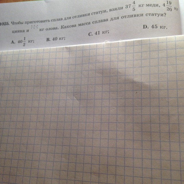 37 4/5 + 4 19/20 = 42 3/4 кг меди и цинка, что гораздо больше вариантов A, B, C. Соответственно, масса сплава 45 кг. А олова взяли 45 - 42 3/4 = 2 1/4 кг.