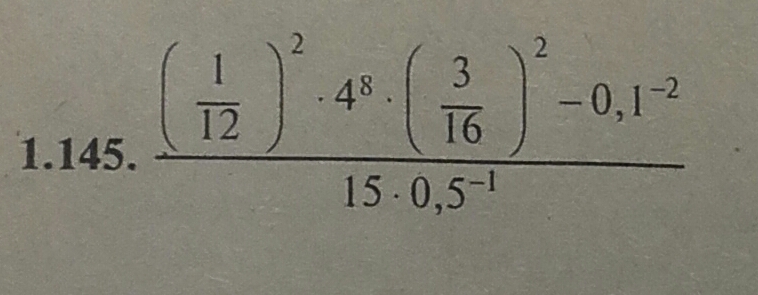 1) ( 1/12)^2 • 4^8 • ( 3/16)^2 - 0,1^-2 = (( 1/12)•(3/16))^2 • 4^8 - 0,1^-2 = ( 1/64)^2 • (64)^2 - 0,1^- 2 = - 0,1^-2 = 10^2 = 100