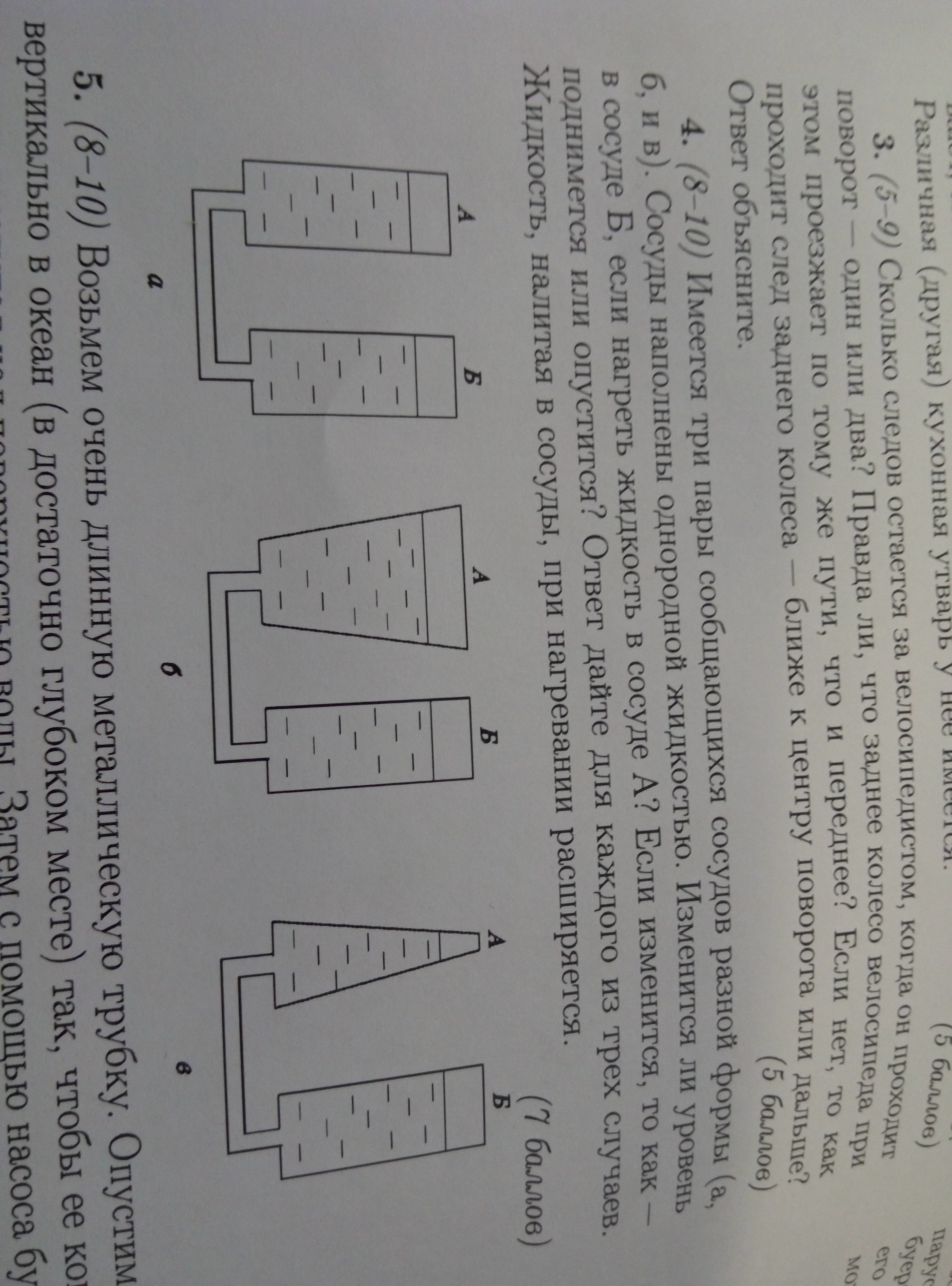 Имеется три пары сообщающихся сосудов разной формы (а,б и в). Сосуды наполнены однородной жидкостью. Изменится ли уровень в сосуде Б, если нагреть жтдкость в сосуде А?Ответ дайте для каждого из трех случаев. Жидкость, налитая в сосуды, при нагревании расширяется.