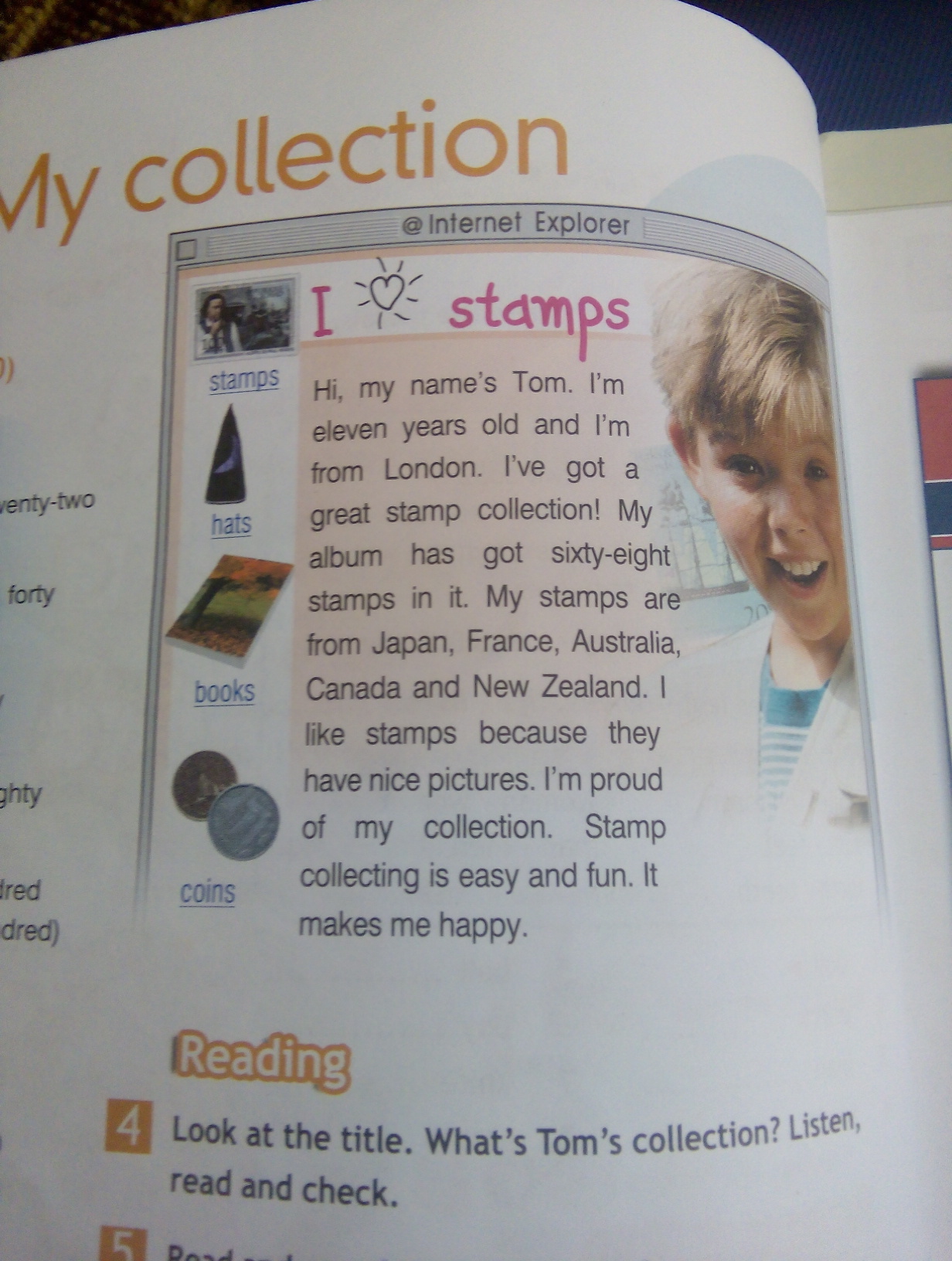 Привет, меня зовут Том. Мне 11 лет, и я из Лондона. У меня есть отличная коллекция марок! В моем альбоме есть 68 марок. У меня есть марки из Японии, Франции, Австралии, Канады и Новой Зеландии. Я люблю марки, потому что на них красивые картинки. Я горжусь своей коллекцией. Коллекционировать марки легко и весело. Это делает меня счастливым.