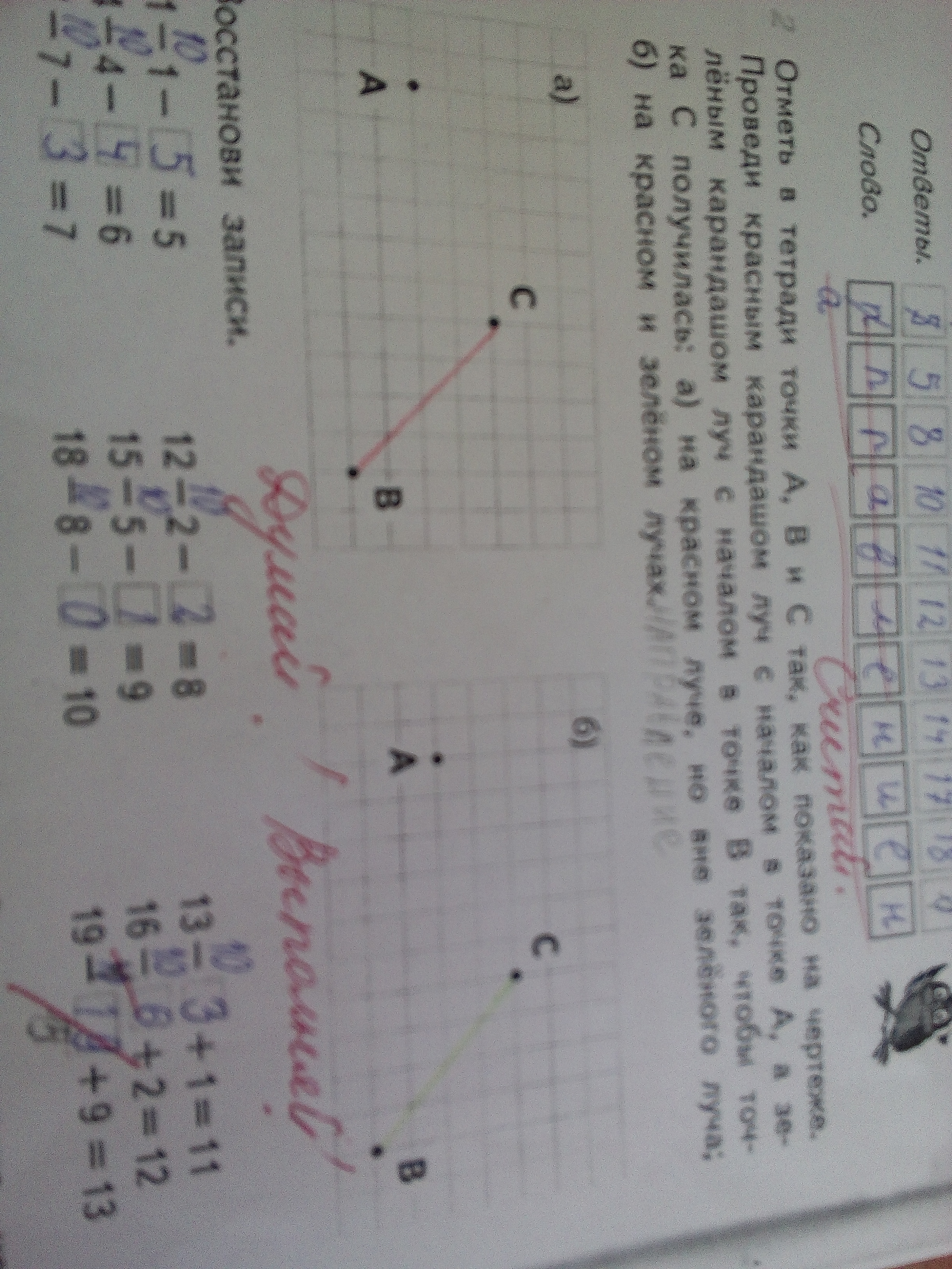 отметь в тетради точки А В И С так как показано на чертеже. проведи красным карандашом луч с началом в точке А а зеленым карандашом луч с началом в