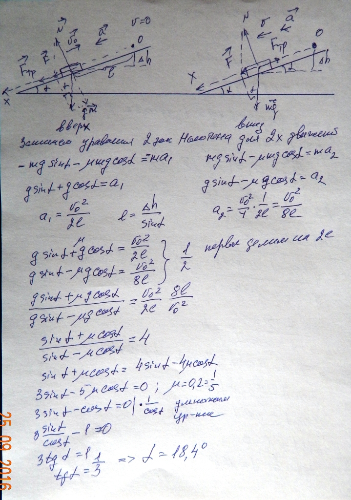 вернулось в точку старта со скоростью, направленной противоположно начальной и вдвое меньшей по модулю. Определите угол наклона плоскости, если коэффициент трения скольжения между ней и телом равен 0,2. Мо- дуль ускорения свободного падения можно считать равным 10 м/с2.