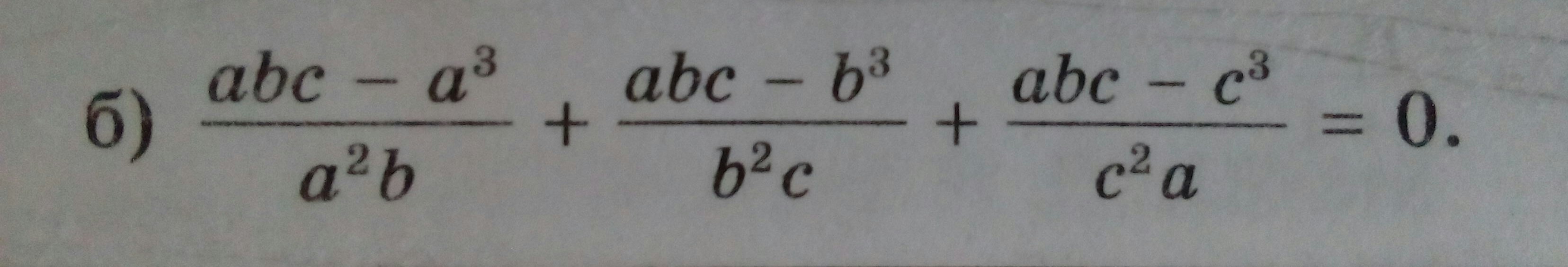 displaystyle  frac{abc-a^3}{a^2b}+frac{abc-b^3}{b^2c}+frac{abc-c^3}{c^2a}= \  \  frac{a(bc-a^2)}{a^2b}+ frac{b(ac-b^2)}{b^2c}+frac{c(ab-c^2)}{c^2a}= \  \