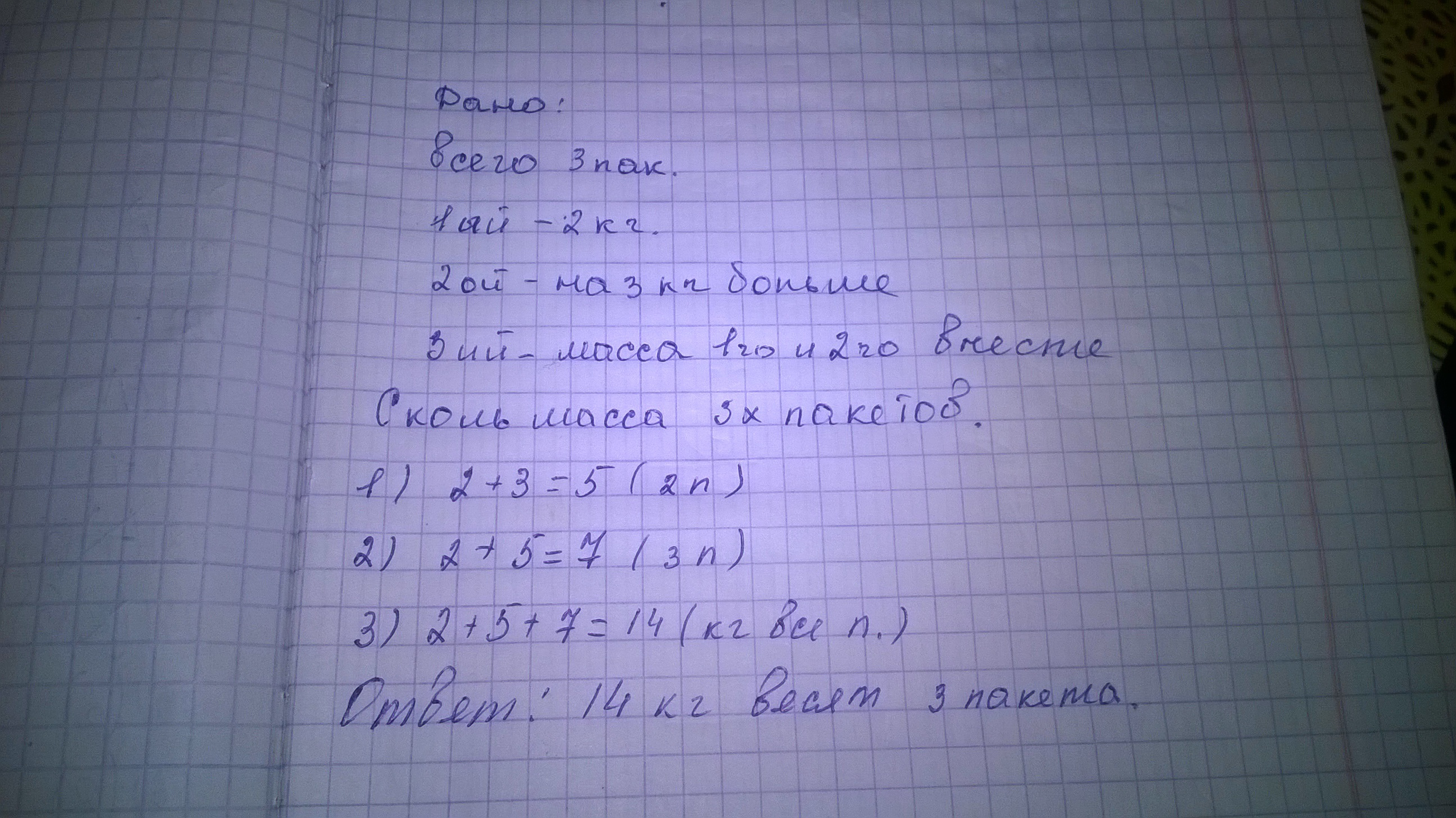 Из магазина принесли три пакета с покупками. Масса первого пакета 2 кг, масса второго пакета на 3 кг больше,а масса третьего равна массе первого и второго