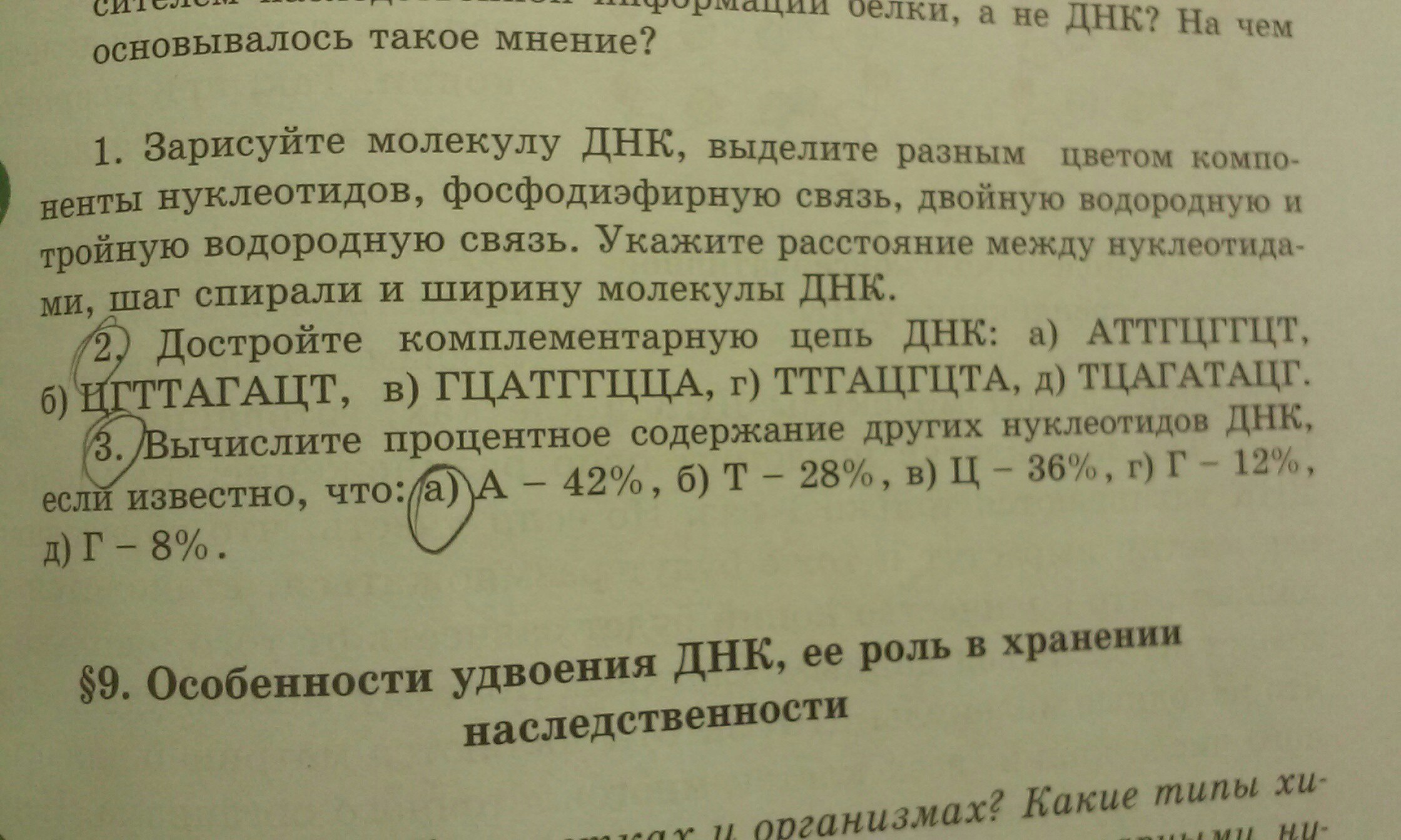 N 2. а) АТТГЦГГЦТ - ТААЦГЦЦГА б) ЦГТТАГАЦТ - ГЦААТЦТГА в) ГЦАТГГЦЦА - ЦГТАЦЦГГТ г) ТТГАЦГЦТА - ААЦТГЦГАТ д) ТЦАГАТАЦГ - АГТЦТАТГЦ. N 3. а) А - 42% => Т =42 % ( А комплементарен Т), 100% - 2*42%= 16% - общее количество Г и Ц. Г комплементарен Ц => 16%/2= 8% -Г и 8% - Ц.