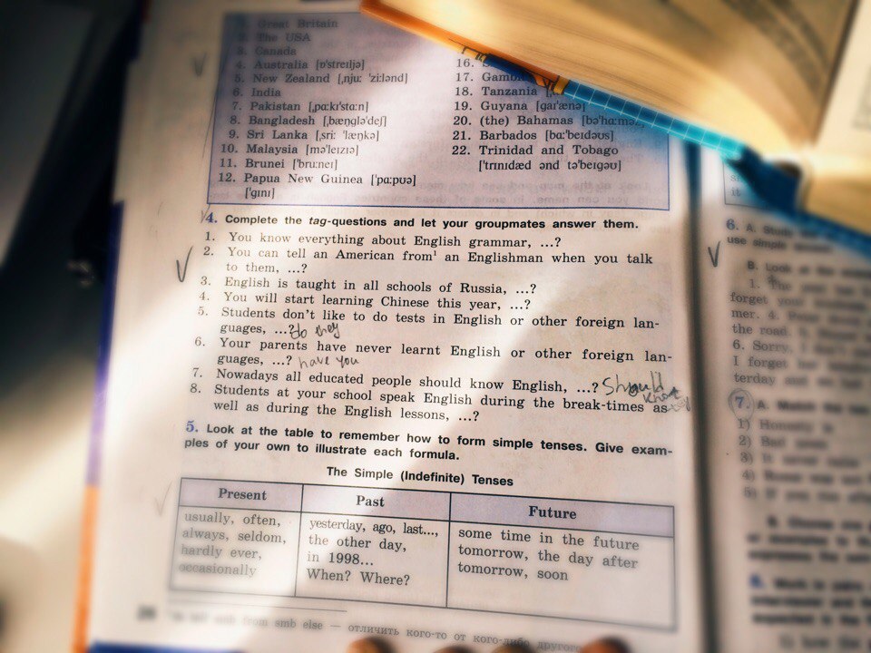 4) 1. Don't you? 2. Can't you? 3. Isn't it? 4. Won't you? 5. Do they? 6. Have they? 7. Shouldn't they? 8. Don't they? 7a) 1e, 2b, 3d, 4b, 5c. 7b) использую 5с. The phrase means that if you decide to do two things at the same time, neither will be done well. Русская версия: За двумя зайцами погонишься, ни одного не поймаешь. Примеры: Steph, you shouldn't agree to attend two interview in the same day, if you run after two hares, you will catch none.