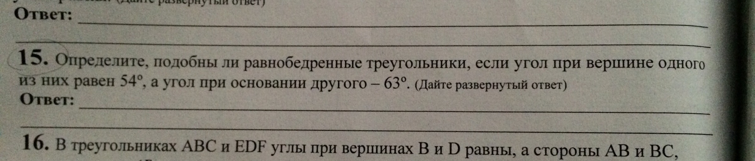 Углы при основании первого треугольника равны (180-54)/2=90-27=63 градуса. Поэтому все три угла первого совпадут с тремя углами второго.