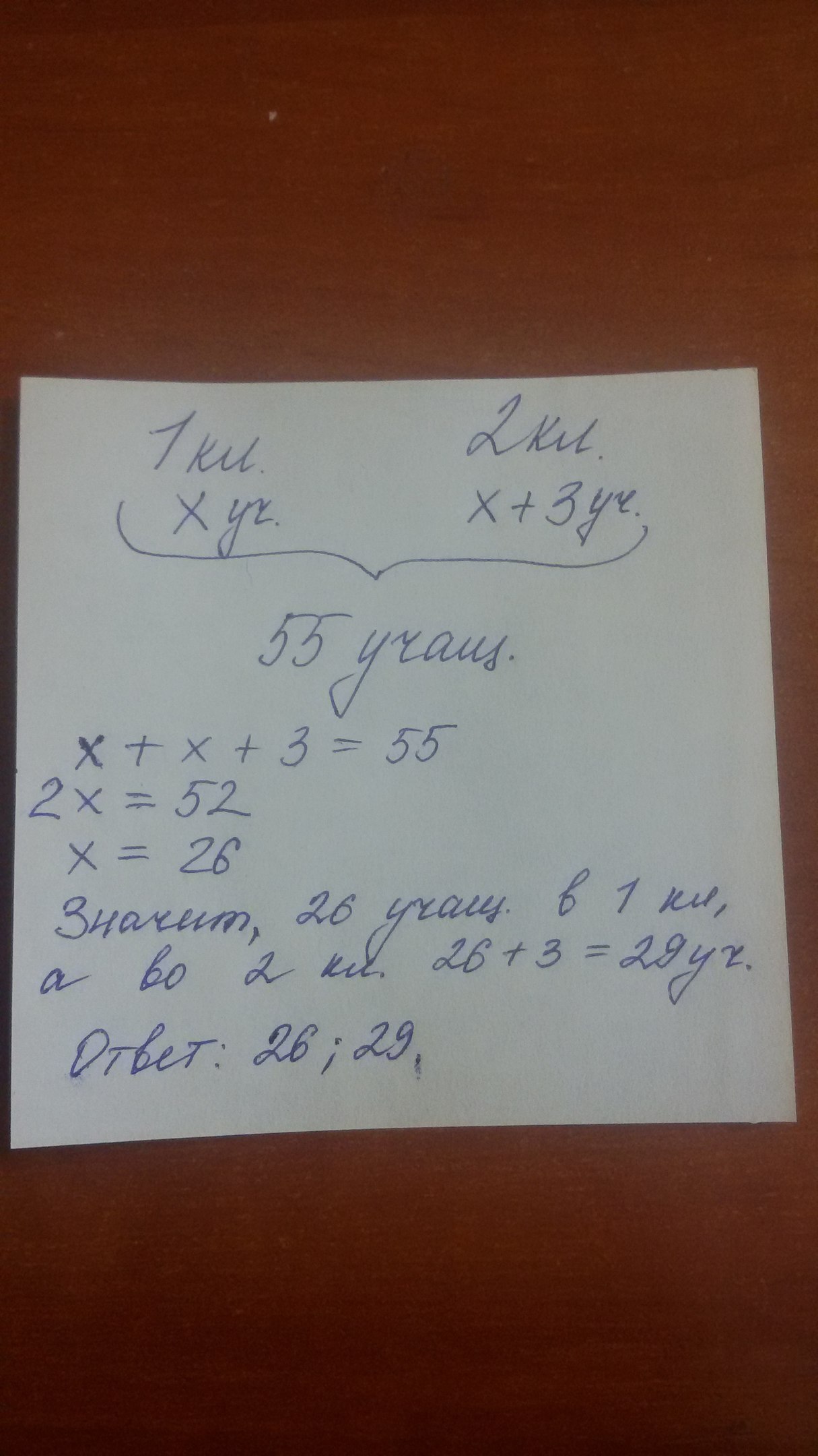 в двух четвертых классах 55 учащихся. сколько учащихся в каждом классе если в одном из них учащихся больше чем в другом на 3 человека.схематический чертеж поможет тебе решить задачу