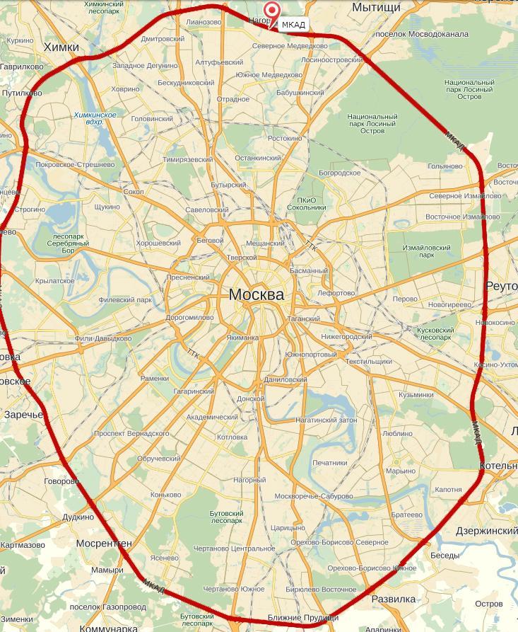 С запада на восток 30 км,с севера на юг 38 км.Общая длина МКАДа 109 км.