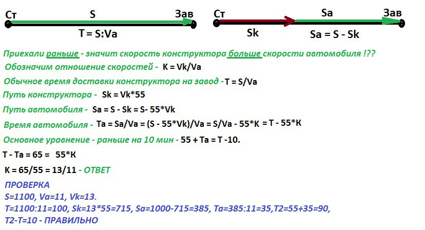Конструктор каждый день приезжал на станции в одно и то же время и в это же время за ним подъезжала машина на которой он ехал на завод однажды конструктор приехал на станцию на 55 минут раньше обычно сразу пошёл навстречу машине приехал на завод на 10 минут раньше обычно во сколько раз скорость конструктора меньше скорости машины