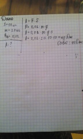 Срочно!!!Вычислите работу при равномерном перемещении на 10м санки массой 20кг,если сила трения санки о снег состовляет 0,02 часть силы тяжести санки?