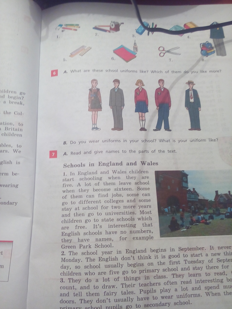 В Англии и Вэльсе дети идут в школу, когда им исполняется 5 лет. Большинство из них уходят из школы в 16. Некоторые находят работу, некоторые идут в разные колледжи, кто-то остается в школе на два и более лет, а потом идут в университет. Большинство детей ходит в гос. школу, которая бесплатна. Интересно, что у английских школьников нет номеров, у них есть названия школ, например, Школа Грин Парк.