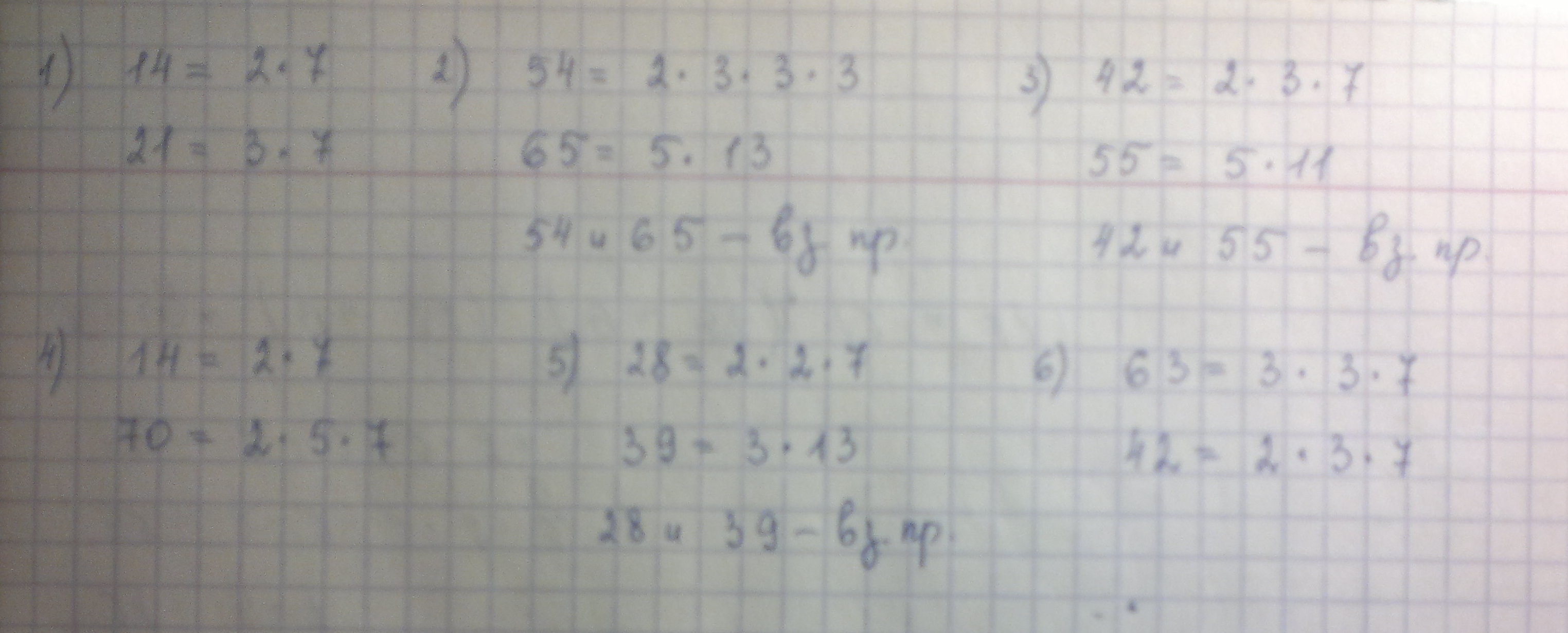 среди данных пар чисел выберите пары взаимно простых чисел 14 и 21? 54 и 65 42 и 55 14 и 70 28 и 39 63 и 42