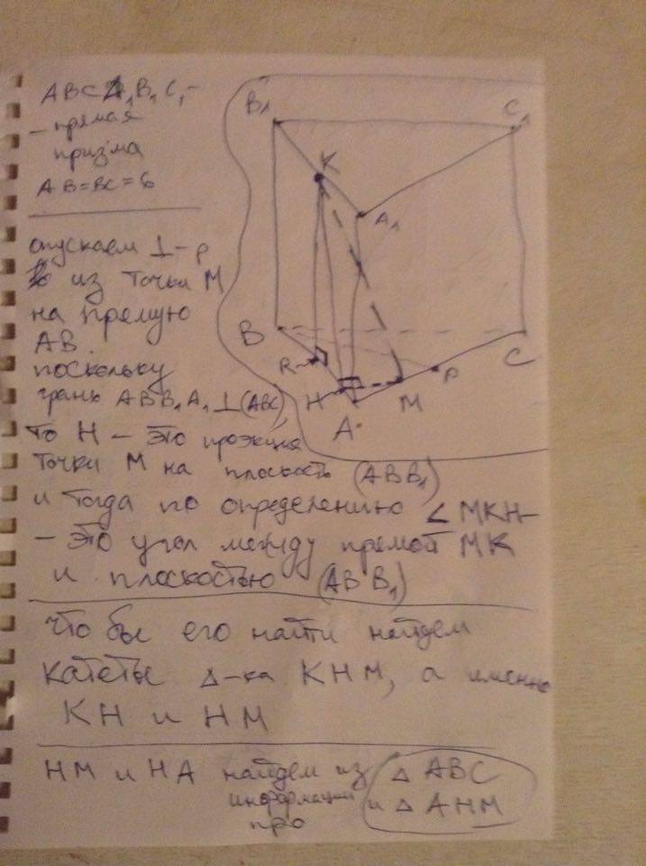 б) Найдите угол между прямой КМ и плоскостью АВВ1, если АВ=6, АС=8и АА1=3