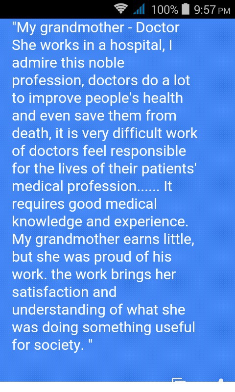 "Моя бабушка - доктор. Она работает в больнице. Я восхищаюсь этой благородной профессией. Врачи много делают для того, чтобы улучшить здоровье людей и даже спасают их от смерти. Это очень сложна работа. Врачи чувствуют себя ответственными за жизнь своих пациентов. Профессия врача требует хороших медицинских знаний и опыта. Моя бабушка немного зарабатывает, но она гордится своей работой. Работа приносит ей удовлетворение и понимание того, что она делает что-то полезное для общества."