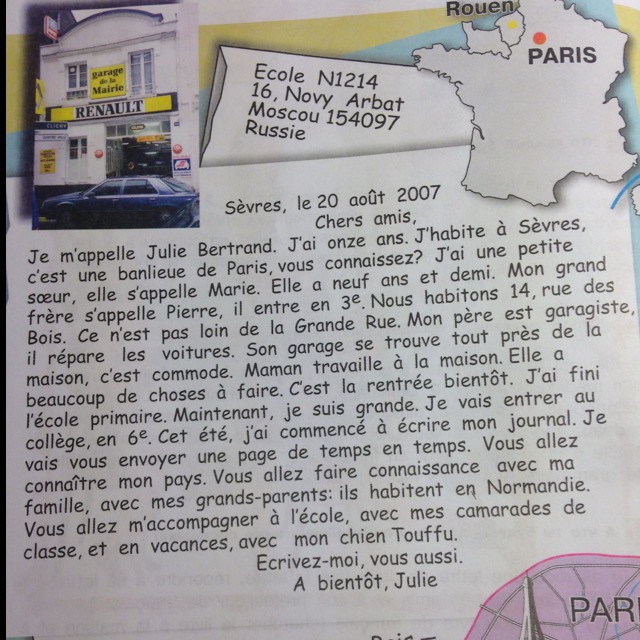 Меня зовут Жюли Бертран. Мне 11 лет. Я живу в Севре, это не далеко то Парижа, вы понимаете? У меня есть маленькая сестра, ее зовут Мари. Ей девять лет с половиной. Моего старшего брата зовут Пьер, он пошел в 3 класс. Мы живем на улице de Bois(так называется улица, и она не переводится на русски)14 дом. Это не далеко от главной улицы. Мой папа гаражист, он чинит машины. Его гараж находится рядом с домом, и это удобно. Мама работает на дому. У нее много дел. Я закончила начальную школу. Сейчас, я уже большая. Я хожу в колледж в шестой класс. Этим летом я начала писать мой журнал. Я пишу страницы время от времени. Вы будите рады моим творчеством. Вы узнаете о моей семье, о моих бабушке и дедушке которые живут в нормандии. Вы будите со мной вместе в школе и с моим щенком Тоффи.
