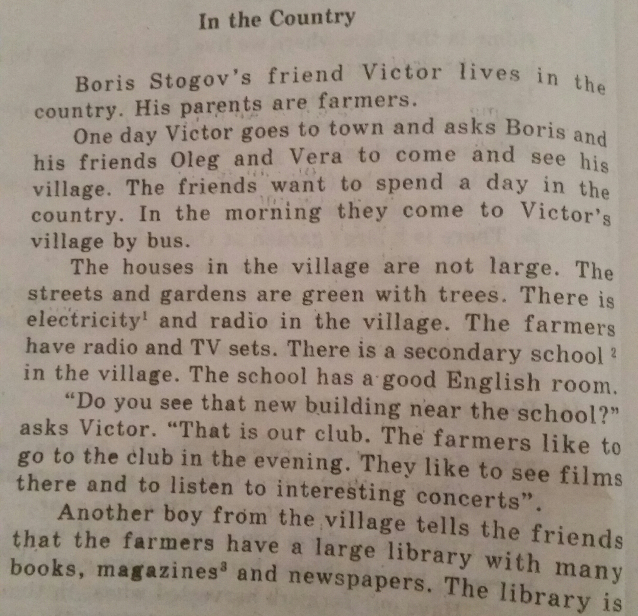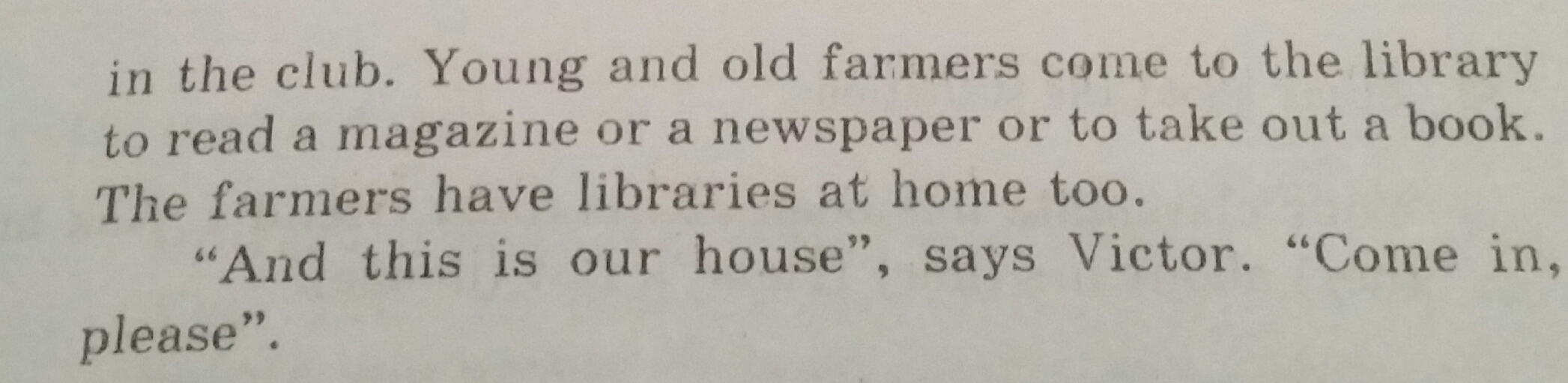 «Ты видел ту новую постройку рядом со школой?»спросил Виктор. «Это наш клуб. Фермеры любят ходить в этот клуб по вечерам. Они любят смотреть фильмы там и слушать интересные концерты».