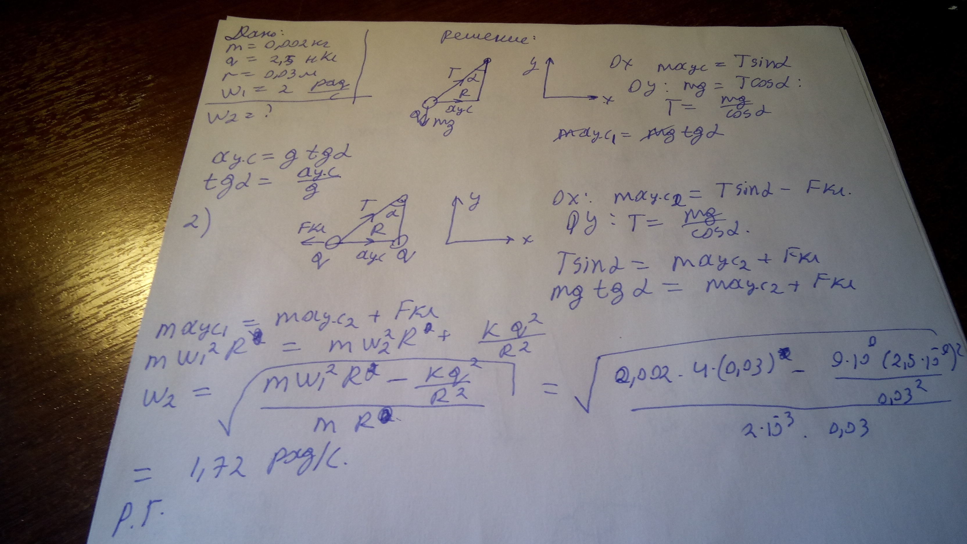 Помоги!!!!!!!!!шарик массой 2г имеющий заряд 2 5 нкл подвешен на нити и движется по окружности радиуса 3 см с угловой скоростью 2 радиана в сек. В центр окр поместили шарик с таким же зарядом. Какой должна стать углавая скорость вращения шарика, чтобы радиус окружности не изменился...помоги пожалуйста!
