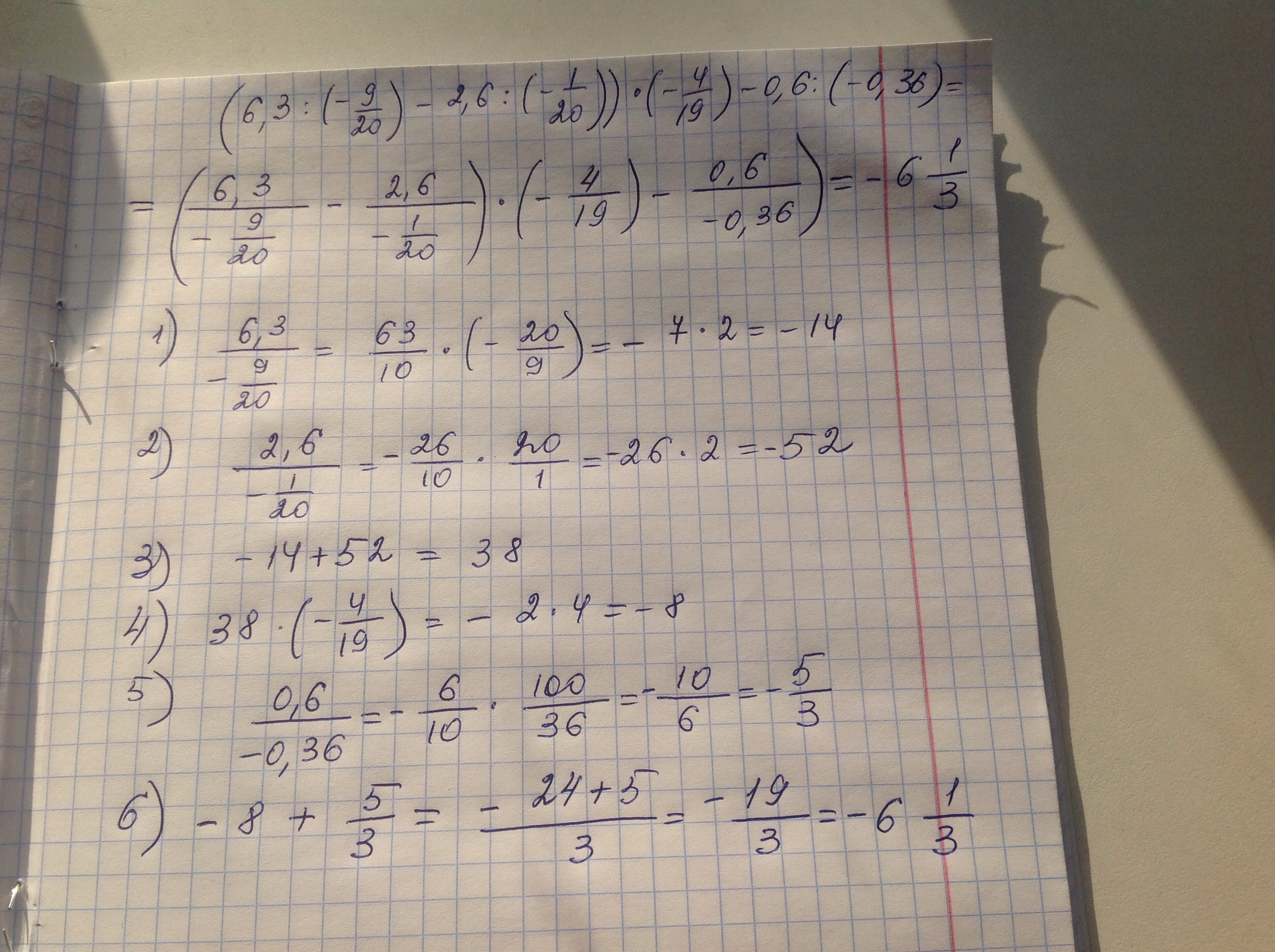 (6,3:(-9/20)-2,6:(-1/20))*(-4/19)-0,6:(-0,36)
