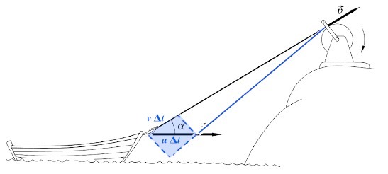 За небольшое время Δt веревка поворачивается и её длина уменьшается на v Δt (см. рисунок). Если уменьшать Δt, отмеченный четырёхугольник превращается в прямоугольник, поэтому