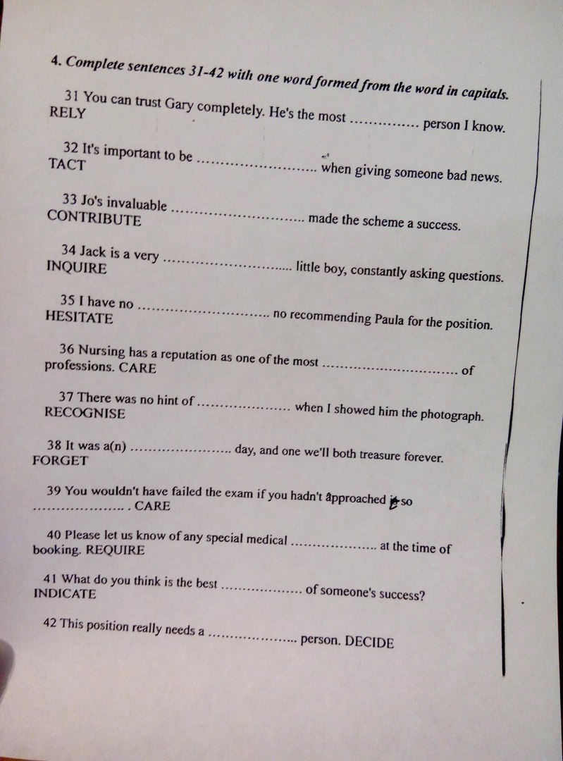 31 reliable 32 tactful 33 contribution 34 inquiring 35 hesitation 36 caring 37 recognition 38 unforgettable 39 carelessly 40 requirement 41 indication 42 decisive