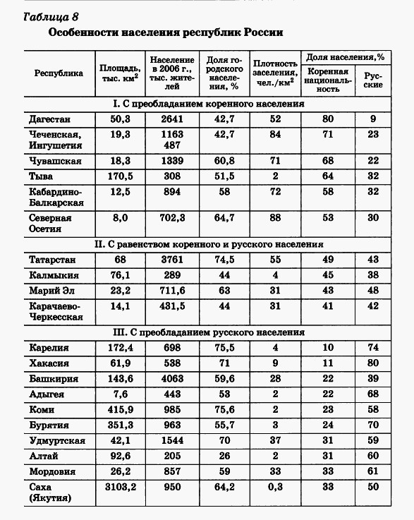 По данным таблицы 8 уточните какие республики имеют наименьшую и наибольшую площадь. Какие из республик имеют наименьшее число жителей,а какие -
