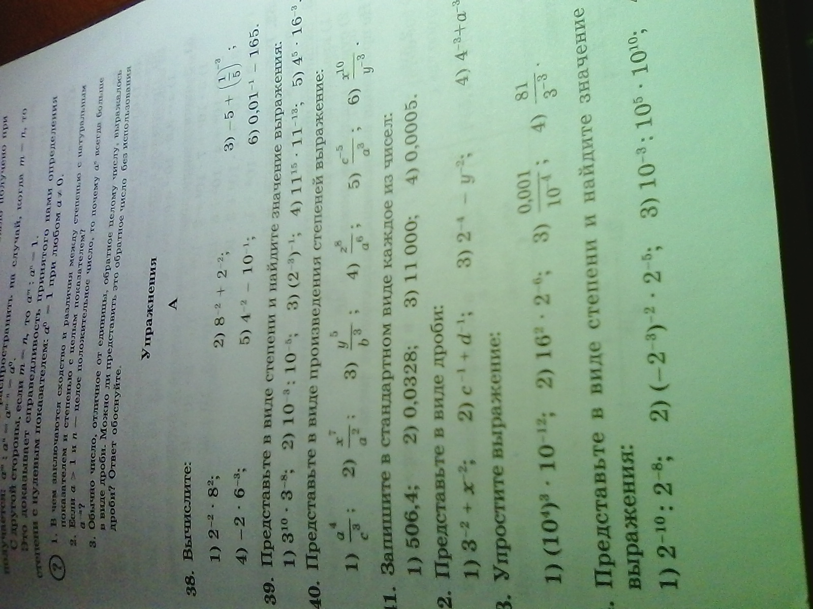 Если число стоит в минусовой степени ,значит надо:1/2^2*8^2=1/4*16=1/64 и по такому принципу делаешь все остальные