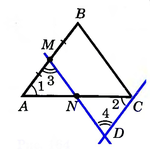 Через точку С проведем прямую, параллельную прямой АВ, и обозначим буквой D точку пересечения этой прямой с прямой MN (рис. 164). Так как АМ=МВ по условию, a MB=CD как противоположные стороны параллелограмма BCDM, то AM=DC. Треугольники AMN и CDN равны по второму признаку равенства треугольников (AM=CD, ∠1=∠2 и ∠3=∠4 как накрест лежащие углы при пересечении параллельных прямых АВ и CD секущими АС и MD), поэтому AN=NC.