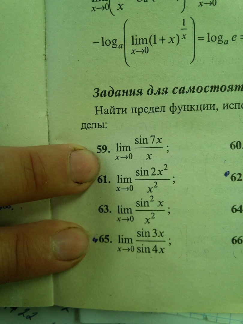 limlimits _{xto 0}frac{sinx}{x}=1; ;; ; limlimits _{alpha (x)to 0}frac{sin, alpha (x)}{alpha (x)}=1\\\ limlimits _{x to 0}frac{sin7x}{x}=limlimits _{xto 0}(frac{sin7x}{7x}cdot 7)=1cdot 7=7\\limlimits _{xto 0} frac{sin2x^2}{x^2} =limlimits _{xto 0}(frac{sin2x^2}{2x^2}cdot 2)=1cdot 2=2\\limlimits _{xto 0} frac{sin^2x}{x^2} =limlimits _{xto 0}(frac{sinx}{x}cdot frac{sinx}{x})=1cdot 1=1