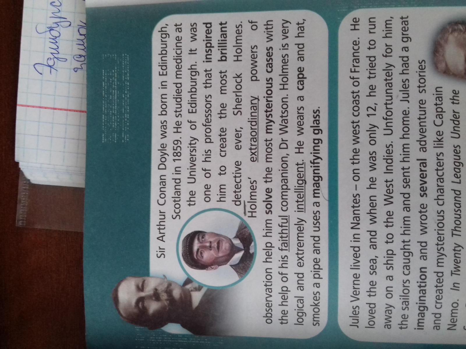 Сэр Артур Конан Дойл родился в Эдинбурге, Шотландия в 1859. Он изучал медицину в Эдинбургском университете. Это был один из его профессоров, которые вдохновили его, чтобы создать самый блестящий детектив в истории, Шерлок Холмс. чрезвычайные полномочия Холмса наблюдения помогают ему решать самые загадочные дела с помощью своего верного спутника, д-р Уотсон. Холмс очень логично и очень умный. Он носит плащ и шляпу, курит трубку и использует лупу.