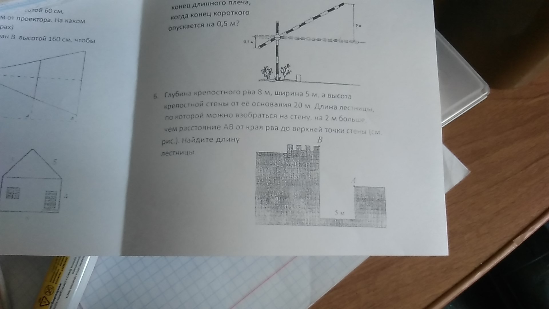 Глубина крепостного рва 8м, ширина 5м, а высота крепостной стены от ее основания 20м. Длина лестницы, по которой можно взобраться на стену, на 2м больше, чем расстояние AB от края рва до верхней точки стены. найдите длину лестницы?