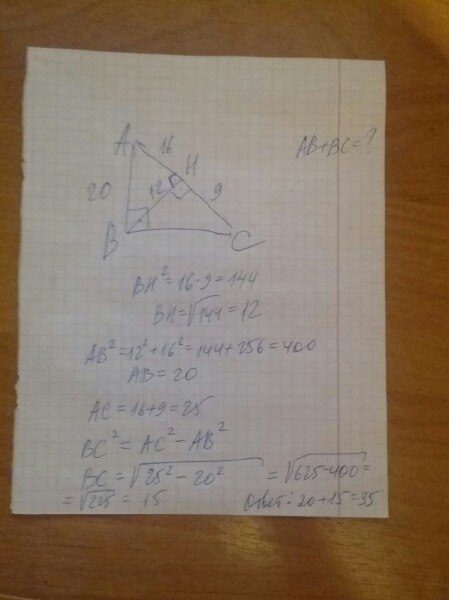 высота прямоугольного треугольника делит гипотенузу на отрезки 16 и 9. Найдите сумму длин катетов.